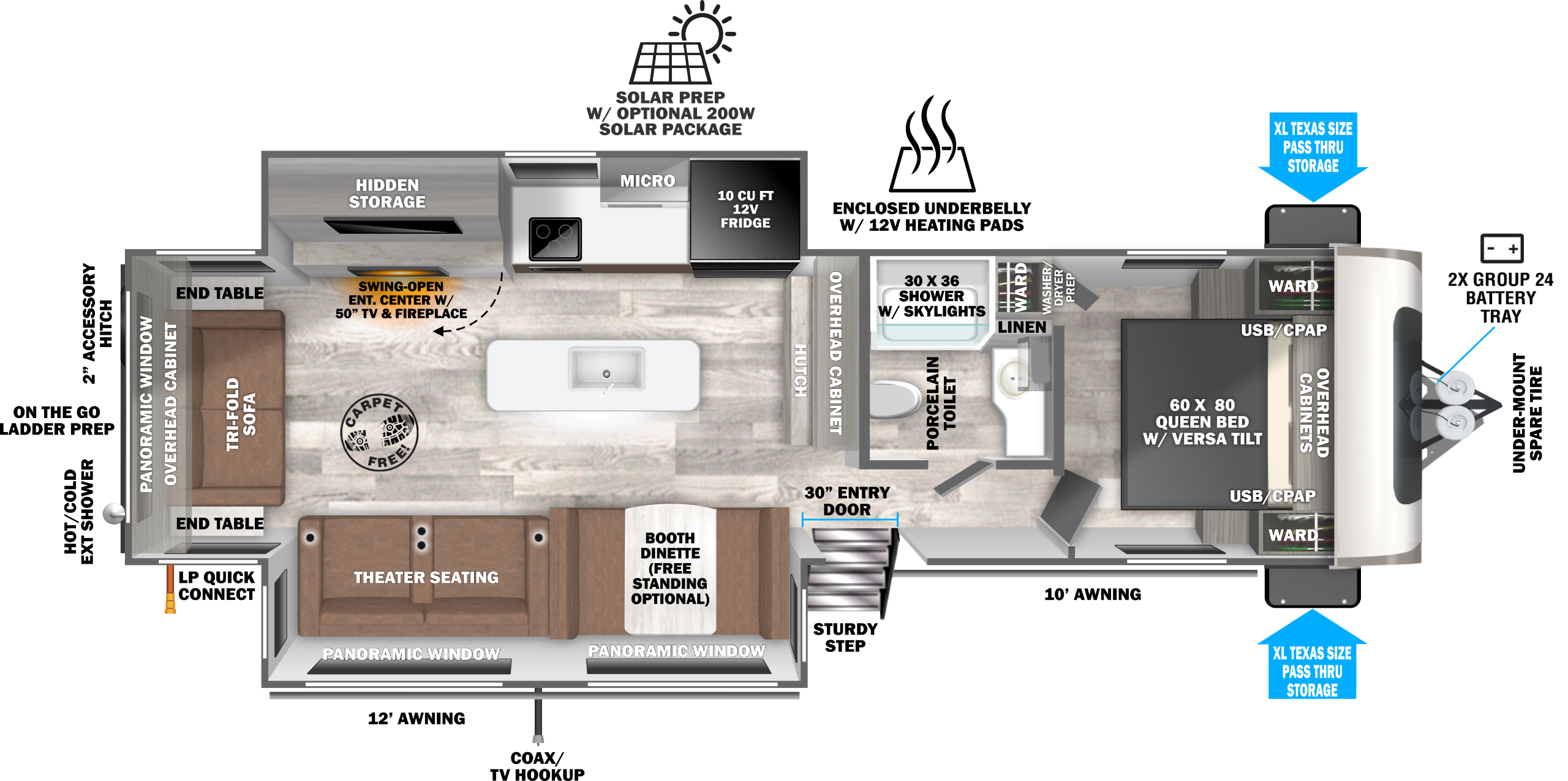 A truly private bedroom, and enormous bathroom make the 22RBHL a crowd favorite. Direct-Viewing of entertainment center, and a massive hidden pantry are one of many great features on this floorplan.
