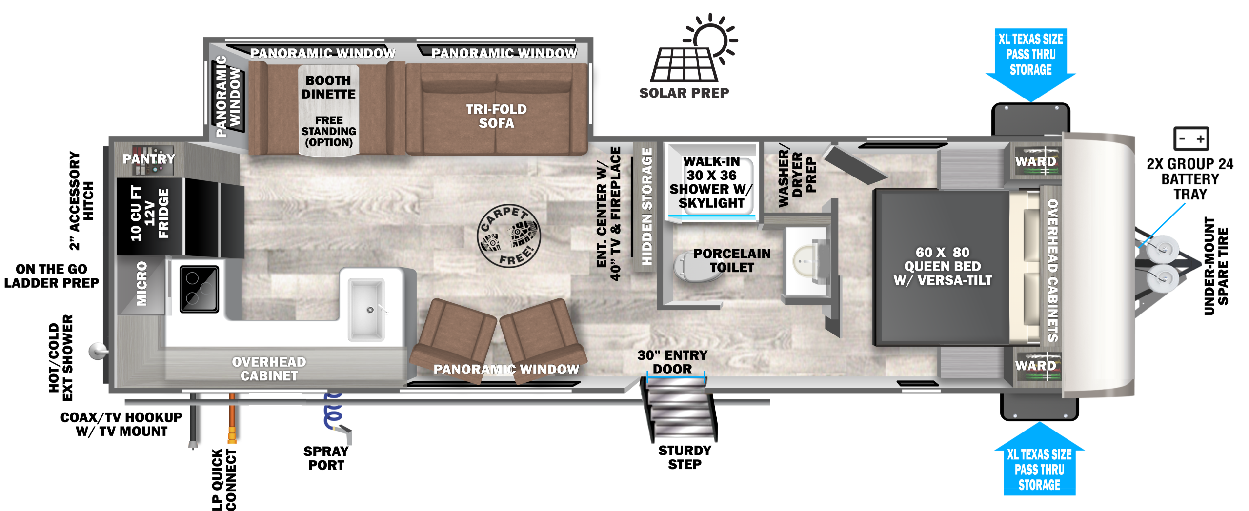 No corners were cut in the 25RBHL. The theater seat (facing the entertainment center) and full-sized dinette separate the best-in-class bathroom and bedroom. 36" wide sliding barn doors offer complete privacy, or the ability to open the 25RBHL up from front to back. This camper also offers a refrigerator outside underneath the awning. Lastly, the hidden pantry is a crowd favorite.