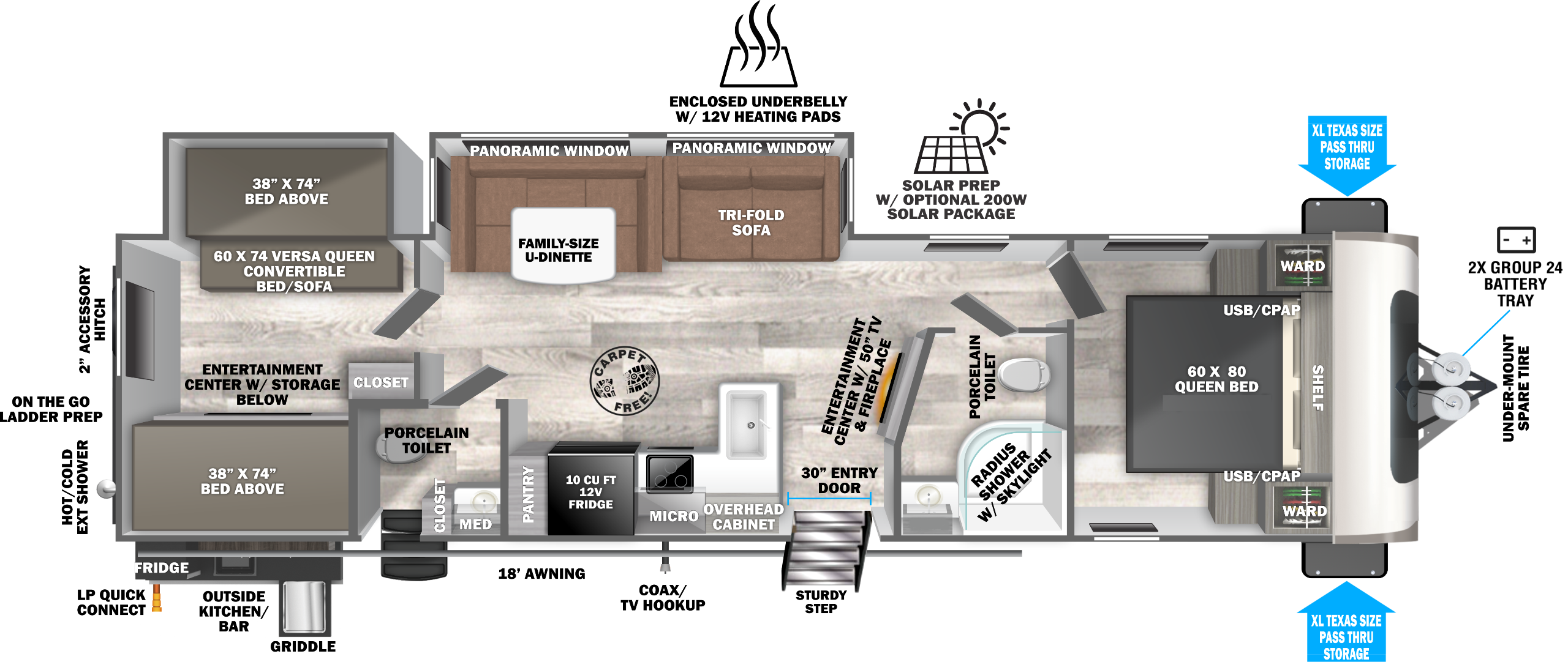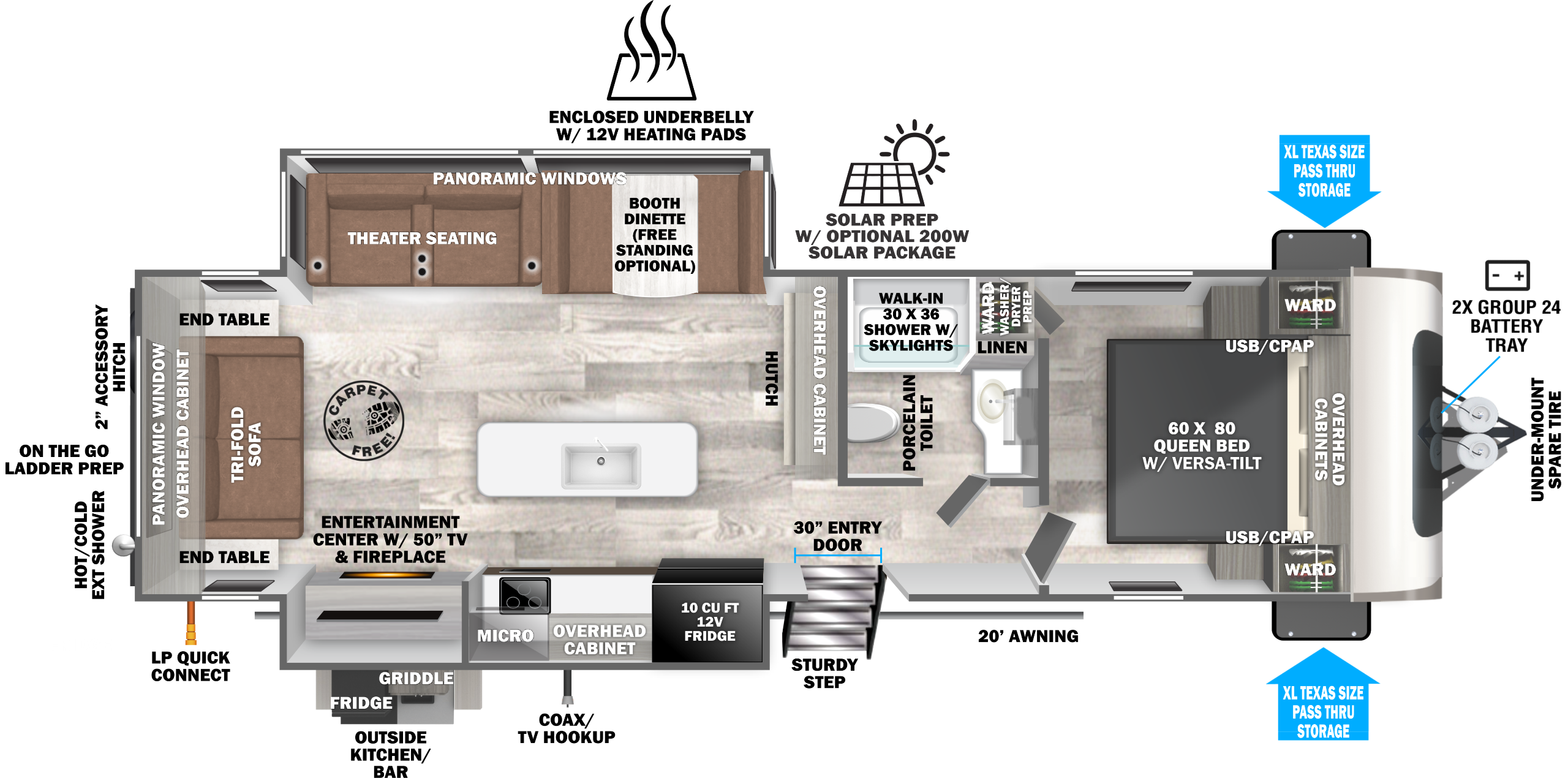 A truly private bedroom, and enormous bathroom make the 22RBHL a crowd favorite. Direct-Viewing of entertainment center, and a massive hidden pantry are one of many great features on this floorplan.
