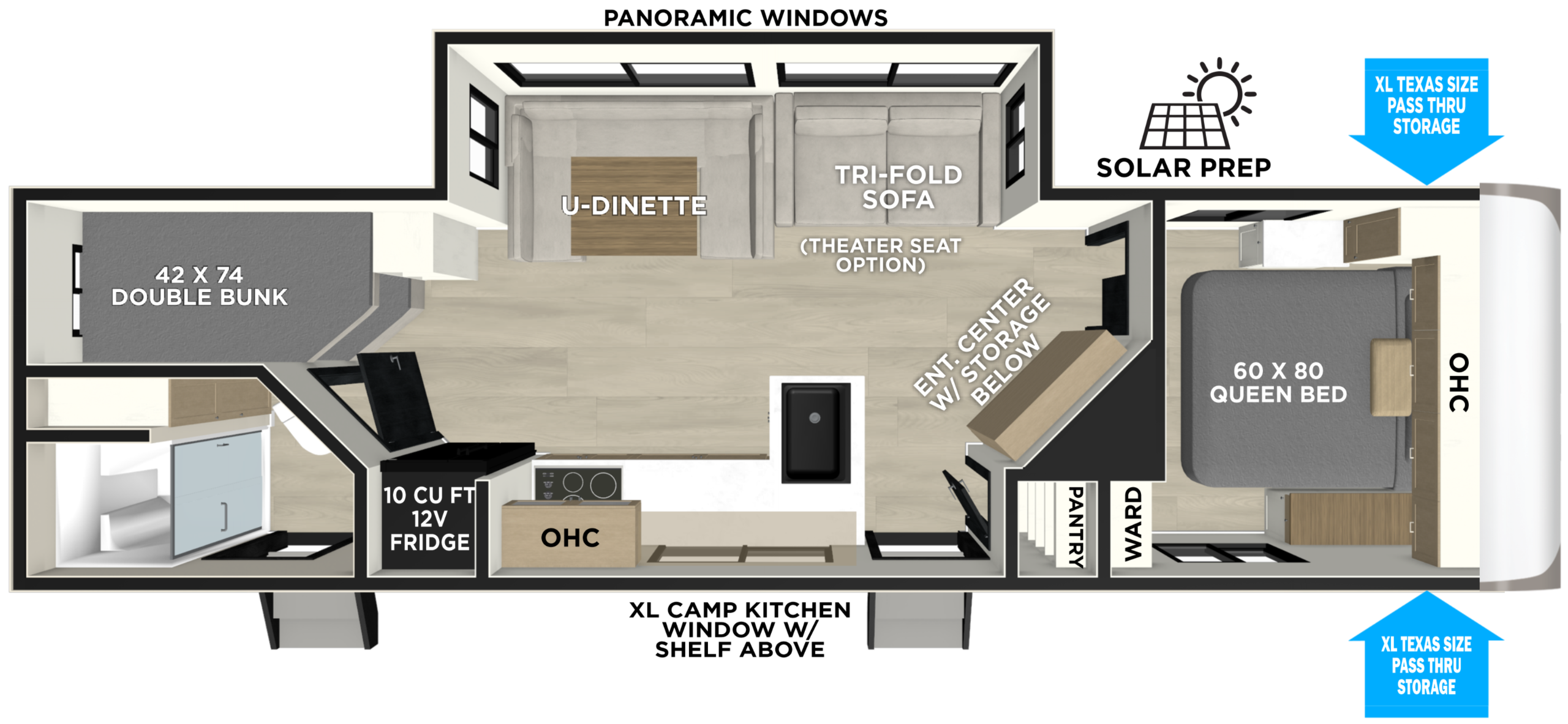 The 25BHHL packs the most punch of any double-over-double bunk model on the market. It features large windows facing both sides of the campsite, 2 entrances (including one into bathroom), and a properly equipped outside kitchen. A large pantry and a power bed are just a couple difference-maker features that this model includes.